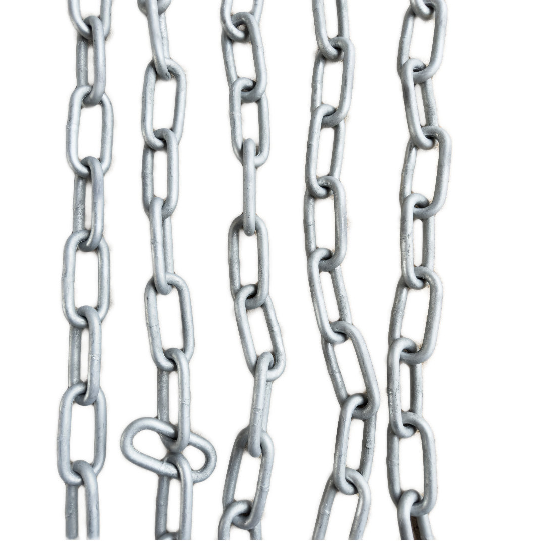 Material och egenskaper: Kättingen har genomgått en varmgalvaniseringsprocess, vilket ger den en extra skyddande zinkbeläggning för att öka dess hållbarhet och motståndskraft mot korrosion. Kättingen är tillverkad i enlighet med DIN763-normen Grade 40, eller Klass 4 som den också kallas. Kättingen är långlänkad vilket gör det enkelt att montera beslag eller fästen i änden på kättingen. Det gör den också lättare än kortlänkad kätting utan att begränsas i styrka.